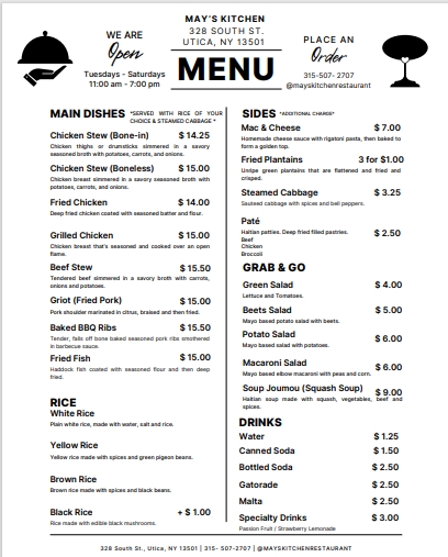 Welcome to May's Kitchen, a delightful Haitian restaurant nestled in Utica, NY. Known for its warm hospitality, May's Kitchen offers an authentic culinary adventure that transports you straight to Haiti. The moment you step inside, you're greeted with joyful energy and the kind of service that makes you feel like family.
